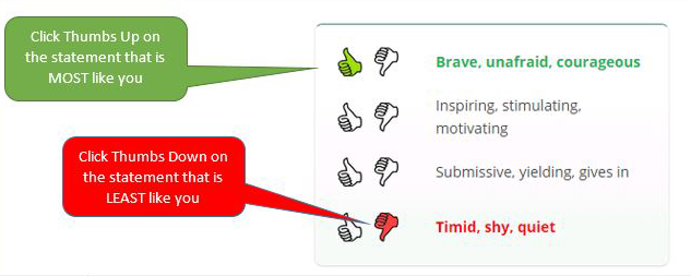 For each group select the Thumbs Up icon next to the statement that is MOST like you and the Thumbs Down icon for the statement that is LEAST like you.